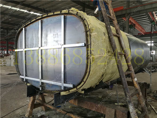 3. 保層溫的制作是在水罐外部另外焊接10mm厚的支撐骨架,然后用保溫材料將骨架內(nèi)部填充滿,最后在骨架外蒙上一層外皮。 保溫層外表鐵皮采用8mm厚高強(qiáng)度耐磨板,可選擇使用不銹鋼分鏡面8K或磨砂板