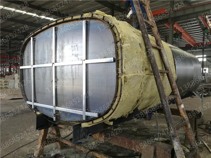 3. 保層溫的制作是在水罐外部另外焊接10mm厚的支撐骨架,然后用保溫材料將骨架內部填充滿,**在骨架外蒙上一層外皮。 保溫層外表鐵皮采用8mm厚高強度耐磨板,可選擇使用不銹鋼分鏡面8K或磨砂板